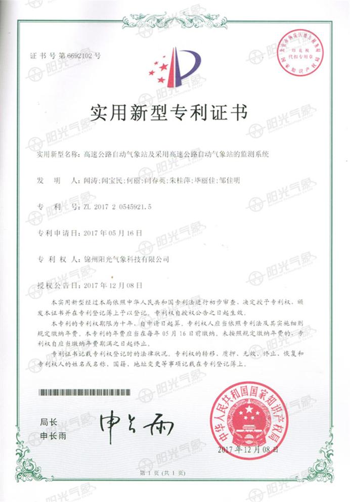 今年錦州陽(yáng)光在高速公路自動(dòng)氣象監(jiān)測(cè)系統(tǒng)領(lǐng)域再取得新突破。2017年5月16日,由陽(yáng)光氣象研發(fā)的“高速公路自動(dòng)氣象站及采用高速公路自動(dòng)氣象站的監(jiān)測(cè)系統(tǒng)”,獲得國(guó)家知識(shí)產(chǎn)權(quán)局實(shí)用新型專利授權(quán),授權(quán)專利號(hào):ZL 2017 2 0545921.5。