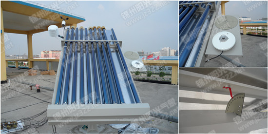 2、全玻璃真空管測試臺臺面裝有日晷,具有太陽光點對正功能,側面安裝輻射表及風速儀等傳感器。