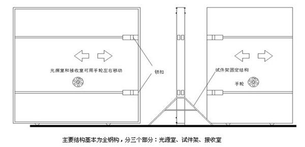 內(nèi)部使用空間3200×3200×2400,表面為高擴(kuò)散率的漫反射涂層,保證了光源室內(nèi)照度均勻性。光源室能輕松用手輪移動(dòng),留出安裝試件的空間。光源室和試件架用電子鎖鎖緊,試件架兩側(cè)有雙密封條,保證了光源室和接收室的光密性。