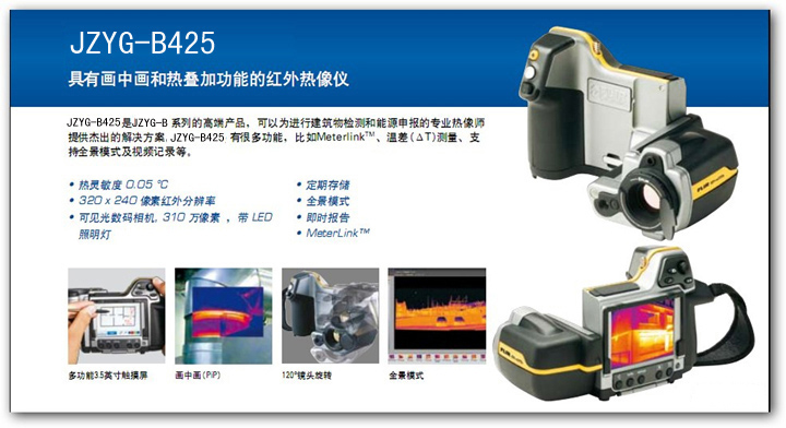 JZYG-B425型紅外熱像儀是具有畫中畫和熱疊加功能的紅外熱像儀,可以進行建筑檢測和能源申報的專業熱像師提供杰出的解決方案。
