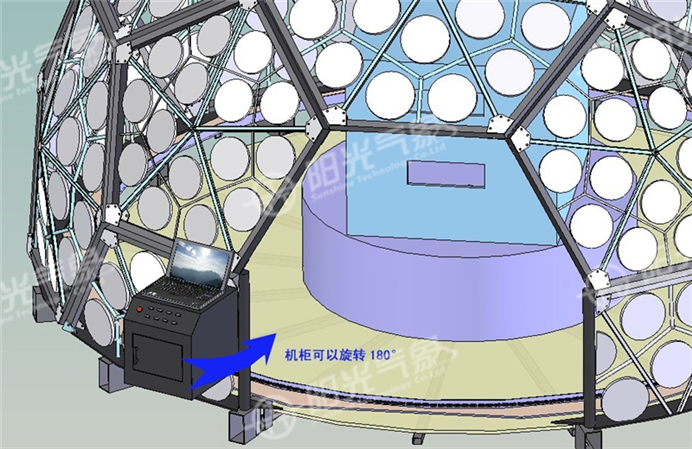 本系統(tǒng)是內(nèi)透光擴(kuò)散形式,采用智能控制技術(shù),增加了太陽模擬燈,不僅可模擬標(biāo)準(zhǔn)的CIE全云天,而且可做日照模擬實驗。光源采用高亮度LED矩陣,節(jié)能而且壽命長免維護(hù)。