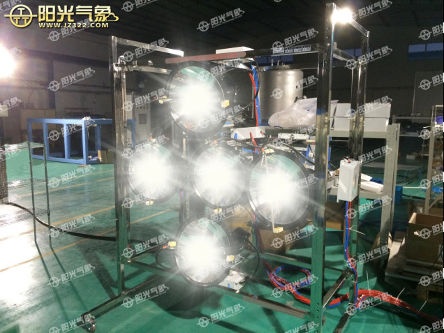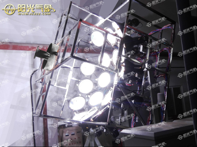 1.1 TRM-PD1H型聚光式太陽模擬發射器(矩陣式)是錦州陽光科技發展有限公司根據多年太陽模擬器生產經驗開發的矩陣式模擬光源(稱人造太陽),專用于太陽能產品室內測試的實驗設備。TRM-PD1H型聚光式太陽模擬發射器(矩陣式)具有操作簡單、使用方便,安全可靠的特點。模擬器光源采用(20)組獨立的聚光點光源,組成矩陣式結構,光源的個數、位置、光強都靈活可調,以保證有效輻照面積內的光均勻性和穩定性。采用主機現場與微機網絡聯合定時控制功能,可以手動或自動啟動光源,定時控制發光時間,為保證光源質量,用太陽輻射儀實時監測光源的輻射及亮度,由于氙燈照射溫度較高,設有測溫報警及電氣漏電保護裝置以保證系統的安全。該產品適用于檢測中心,科研機構,太陽能產品生產廠家等單位。