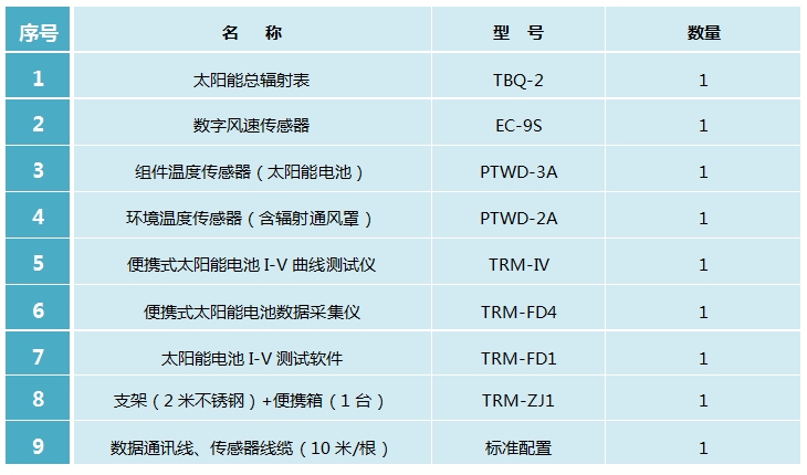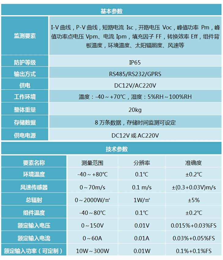 2、可測量參數: I-V曲線,P-V曲線,短路電流,開路電壓,峰值功率,峰值功率點電壓、電流,填充因子,轉換效率,組件背板溫度,環境溫度、太陽輻照度、風速等。