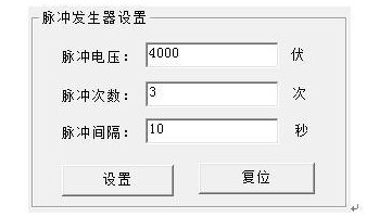 設置:設置完成后,點擊"設置"按鈕,系統將保存測試參數,同時發送給脈沖發生器,此時脈沖發生器的顯示屏上將會顯示當前設置的脈沖電壓