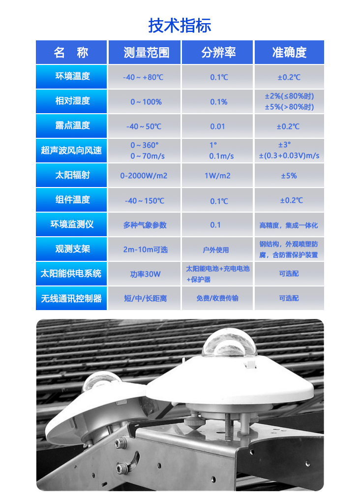 本產品是針對光伏發電站研發生產的一款最新型一體化光伏環境監測儀,該設備采用新型一體化結構設計,測量精度高,安裝使用方便,可采集多種要素:含太陽輻射(水平/斜面)、溫度、濕度、風速、風向、大氣壓力、背板溫度等要素,要素可按需定制。