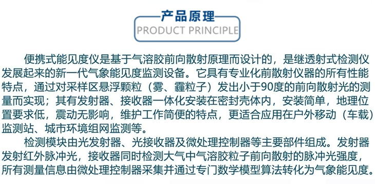便攜式能見度儀是基于氣溶膠前向散射原理而設計的,是繼透射式檢測儀發展起來的新一代氣象能見度監測設備。它具有專業化前向散射儀器的所有性能特點,通過對采樣區懸浮顆粒發出小于90度的前向散射光的測量而實現;設備發射器、接收器一體化安裝在密封殼體內,安裝簡單,地理位置要求低,振動無影響。