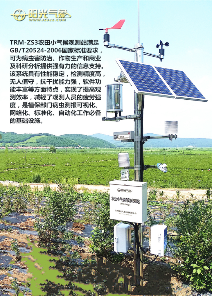 TRM-ZS3農(nóng)田小氣候觀測(cè)站滿足GB/T 20524-2006國(guó)家標(biāo)準(zhǔn)要求,可為病蟲(chóng)害防治、作物生產(chǎn)和商業(yè)及科研分析提供強(qiáng)有力的信息支持。該系統(tǒng)具有性能穩(wěn)定,檢測(cè)精度高,無(wú)人職守,抗干擾能力強(qiáng),軟件功能豐富等方面特點(diǎn)。