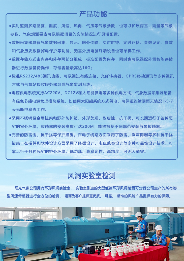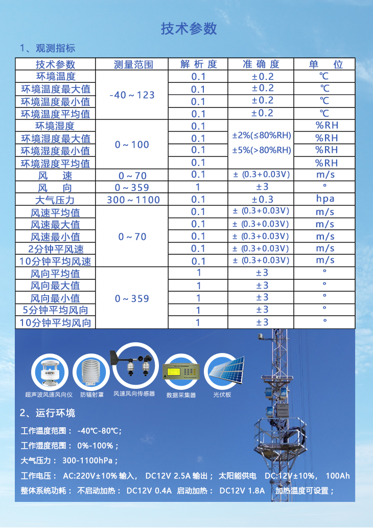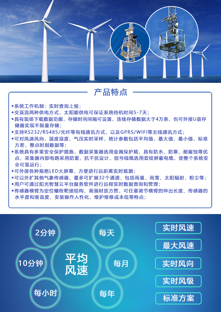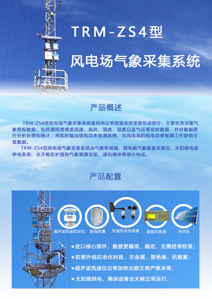 TRM-ZS4型風電場氣象采集系統是風電功率預測系統重要組成部分,主要負責采集氣象預報數據,包括測風塔梯度風速、風向、溫度、濕度以及氣壓等實時數據、并對數據進行分析處理和統計,再實時輸出給風功率預測系統,為風電場的風電功率預測工作提供可靠數據。TRM-ZS4型風電場氣象采集系統由氣象傳感器、微電腦氣象數據采集儀、太陽能電源供電系統、全天候防護箱和氣象觀測支架、通訊模塊等部分構成。