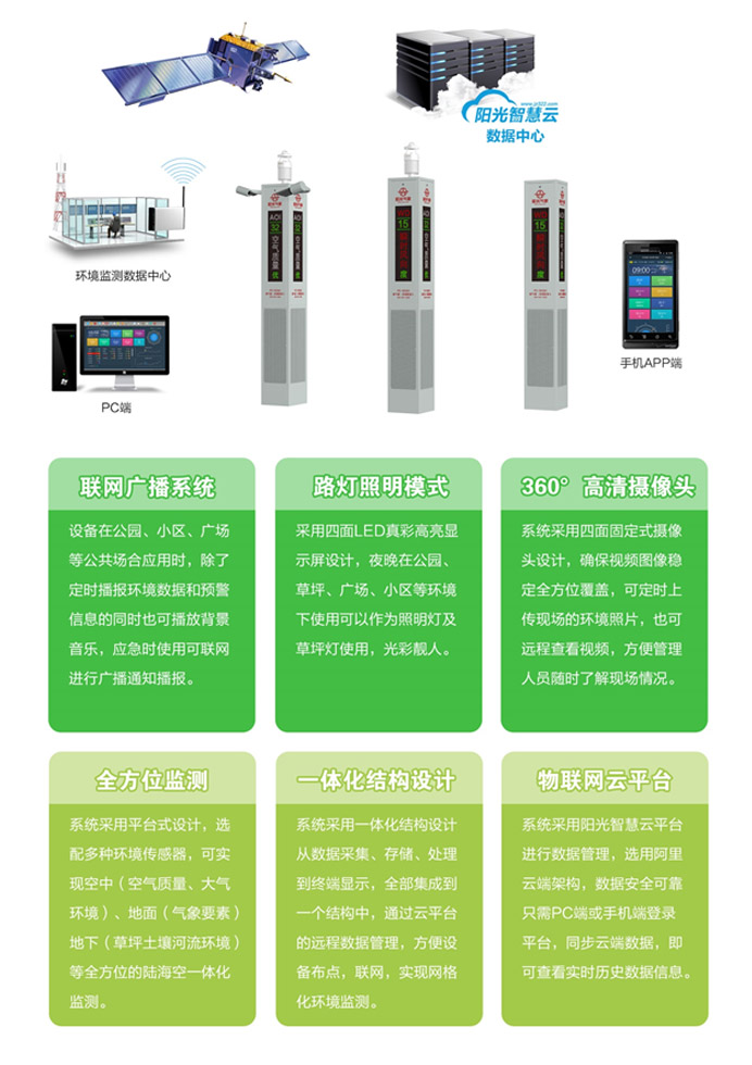 本系統由數據采集器、傳感器、無線傳輸系統、后臺數據處理系統及信息監控管理平臺組成。監測子站集成了大氣PM2.5、PM10監測、環境溫濕度及風速風向監測、噪聲監測、負氧離子、有毒有害氣體監測(選配)等多種功能;數據平臺是一個互聯網架構的網絡化平臺,具有對各子站的監控功能以及對數據的報警處理、記錄、查詢、統計、報表輸出等多種功能。