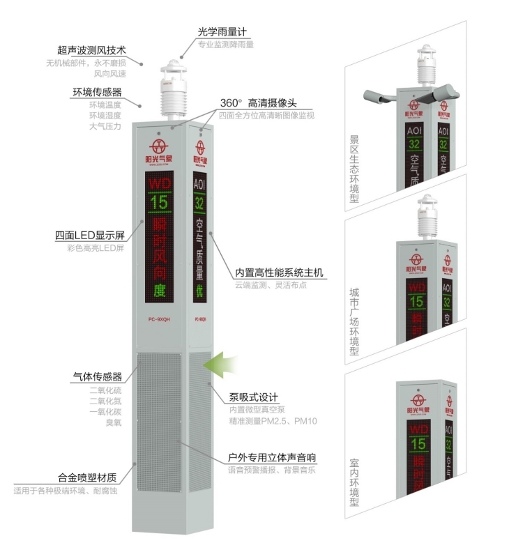 PC-9XQH 景區氣象站以“物聯網+智慧感知”為核心,建立覆蓋全區域的環境空氣質量自動監測網絡,并實時顯示播報。景區氣象站由金屬外殼立柱、氣象環境傳感器、系統采集主機、LED顯示、智能語音播報、物聯網云平臺數據存儲、終端顯示組成。