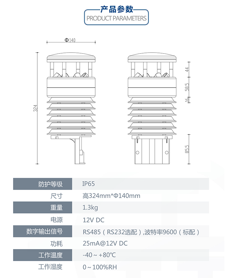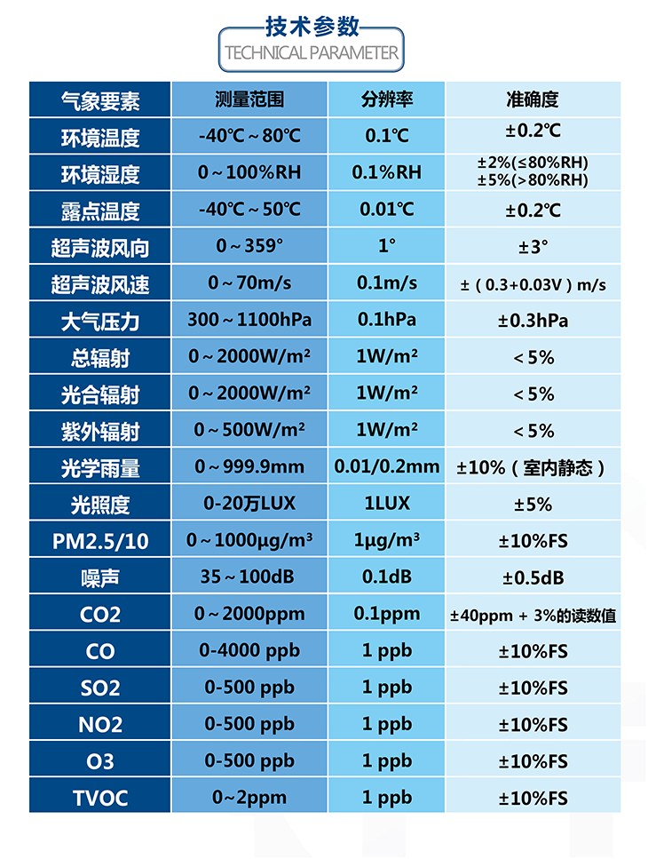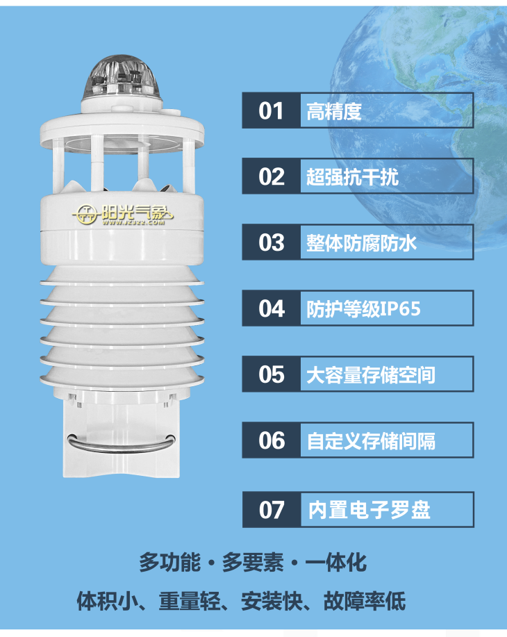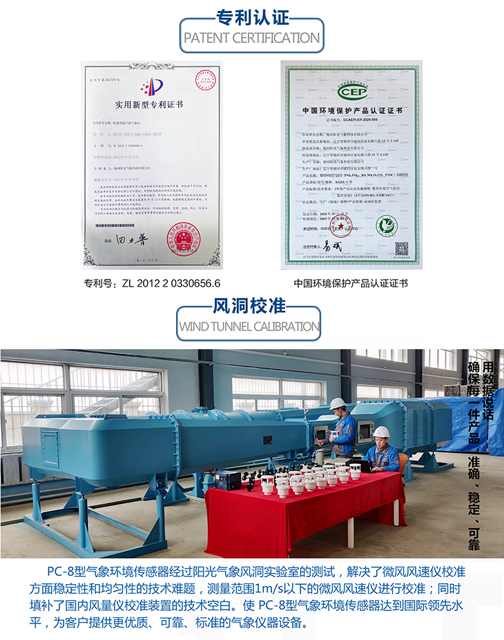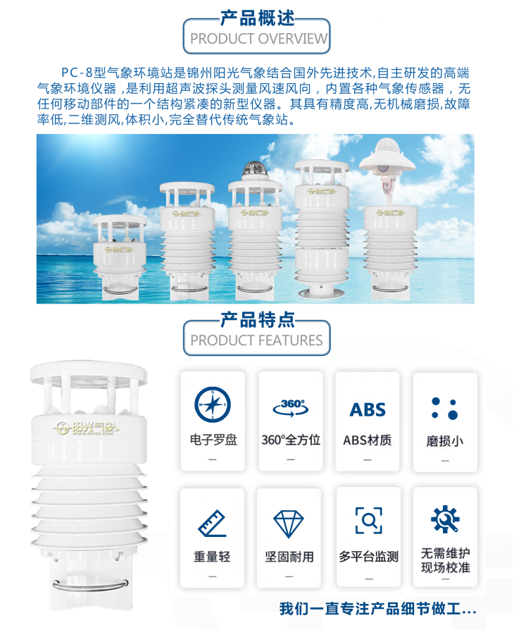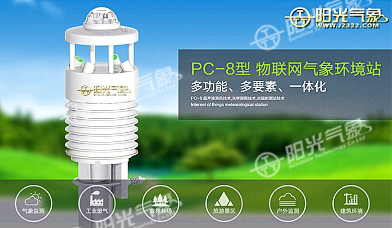 PC-8型氣象環境站是錦州陽光氣象結合國外先進技術,自主研發的高端氣象環境儀器,是利用超聲波探頭測量風速風向,內置各種氣象傳感器,無任何移動部件的一個結構緊湊的新型儀器。其具有精度高,無機械磨損,故障率低,二維測風,體積小,完全替代傳統氣象站。