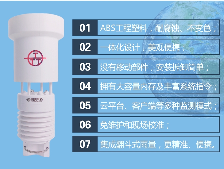 PC-8K型氣象六參數環境監測儀是我公司自主研制的一款測量多種氣象要素的專業級一體化氣象站,可同時測量大氣溫度、大氣濕度、風速、風向、氣壓、雨量等主要氣象要素。其中雨量為高精度翻斗式雨量傳感器,其特點是精度高,響應速度快,串口輸出,方便用戶直接通過PC或外接儀器進行采集。