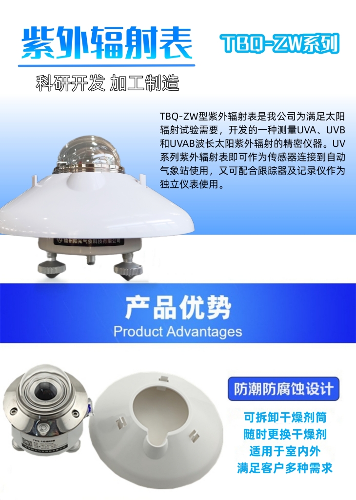 TBQ-ZW型紫外輻射表是我公司為滿足太陽輻射試驗的需要,開發的一種測量UVA、UVB和UVAB波長太陽紫外輻射的精密儀器。UV系列紫外輻射表即可作為傳感器連接到自動氣象站使用,又可配合跟蹤器及記錄儀作為獨立儀表使用。