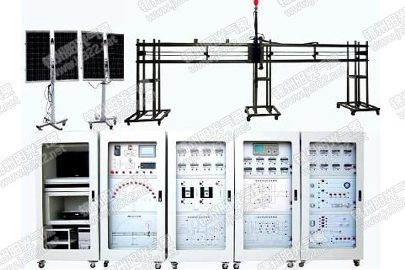 YG-JXST05型大型模擬太陽升降、太陽跟蹤、光伏發(fā)電、充電逆變實(shí)訓(xùn)裝置采用1000W節(jié)能燈模擬太陽,實(shí)驗(yàn)裝置可以模擬太陽的弧線升降全過程,而且模擬太陽的升降時(shí)間可以根據(jù)實(shí)驗(yàn)需要進(jìn)行更改。兩臺(tái)太陽跟蹤系統(tǒng)對(duì)模擬太陽的移動(dòng)進(jìn)行跟蹤,兩臺(tái)太陽跟蹤系統(tǒng)上的光伏發(fā)電裝置分別在模擬太陽下的進(jìn)行發(fā)電,并在充電控制系統(tǒng)的控制下向蓄電池充電,逆變系統(tǒng)對(duì)蓄電池的直流電進(jìn)行逆變,產(chǎn)生220V交流電,并給燈泡交流電機(jī)等負(fù)載供電。