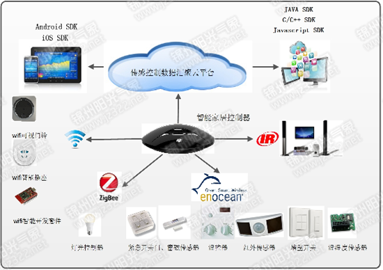 智能家居沙盤實(shí)訓(xùn)系統(tǒng)采用完整的物聯(lián)網(wǎng)技術(shù)架構(gòu),即感知層、傳輸層和應(yīng)用層,前端采用智能傳感器控制節(jié)點(diǎn)采集各種數(shù)據(jù)并控制各種被控對(duì)象,傳輸層通過EnOcean,ZIGBEE、WIFI、3G網(wǎng)絡(luò)接入智能網(wǎng)關(guān),將各種數(shù)據(jù)傳輸至云端服務(wù)器進(jìn)行數(shù)據(jù)處理并反饋給控制器。系統(tǒng)包含了智能視頻服務(wù)、Niagara 智能中間件、3D虛擬現(xiàn)實(shí)交互和云計(jì)算中心等平臺(tái),軟硬件設(shè)計(jì)資源可開放供教學(xué)科研使用。系統(tǒng)使用的設(shè)備包括支持各類通信協(xié)議的傳感器、WIFI無線門鈴、指紋人臉I(yè)C卡識(shí)別門禁設(shè)備、紅外感應(yīng)器、室內(nèi)監(jiān)控?cái)z像頭、WIFI插座、電器控制器、電動(dòng)窗簾、門、窗磁傳感器、無線無源開關(guān)、背景音箱、電視機(jī)和冰箱等各種被控模擬設(shè)備。