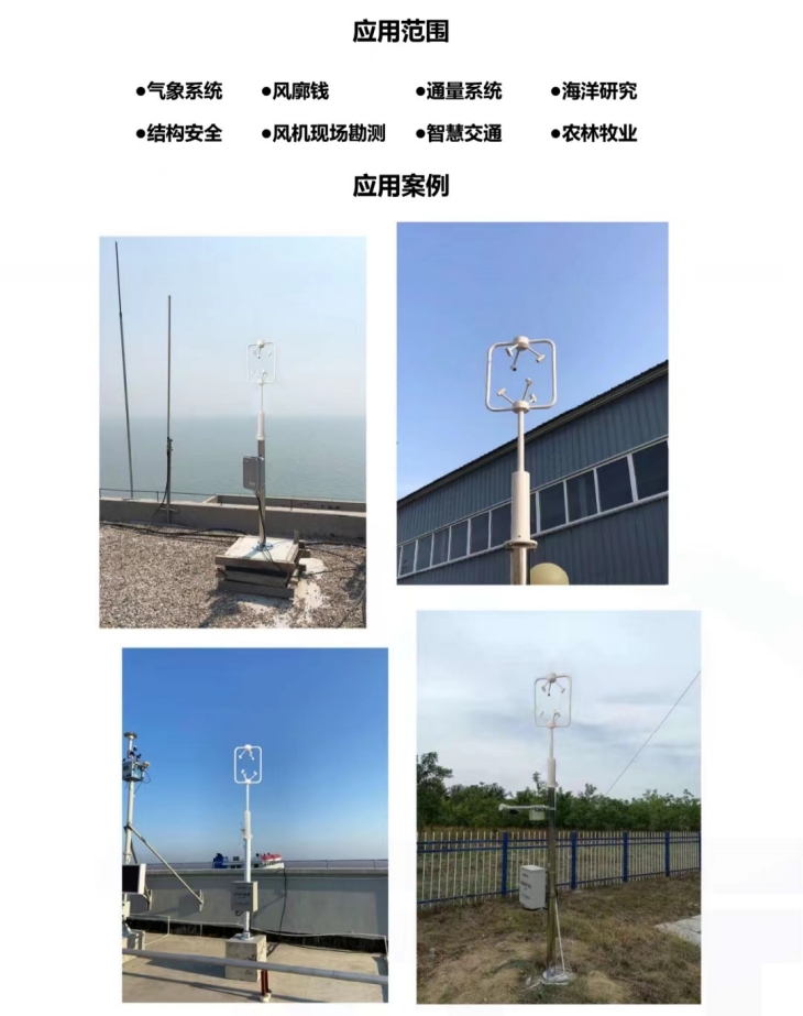 三維超聲波風速風向傳感器具有結構緊湊,沒有任何移動部件,堅固 耐用的特點。能夠測量水平和垂直方向的風向, X/Y/Z軸風速(即U、V、 W矢量輸出)。可以適應在各種環境下,全天候、長久的正常工作,為各 領域的氣象監測提供可靠數據。三維超聲波風向風速傳感器用來測量近 地風向、風速。廣泛應用于城市環境監測、風力發電、氣象監測、橋梁 隧道、航海船舶、航空機場等領域。